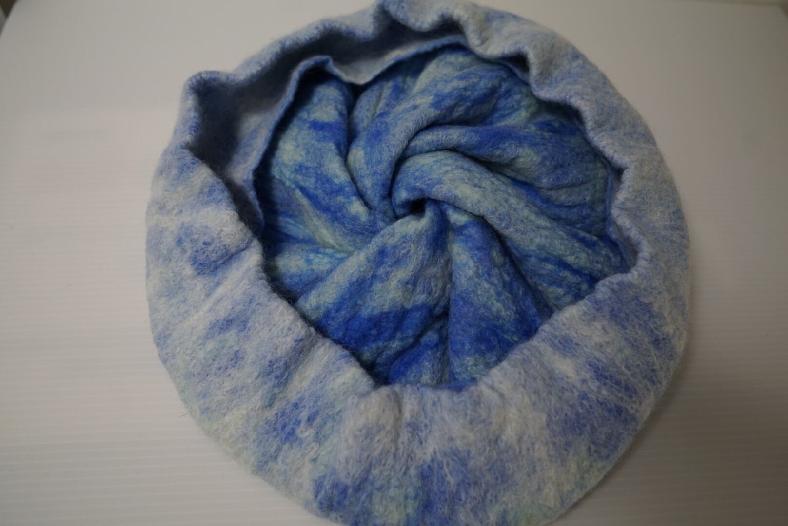 青のしずくのサウナハット。少しめずらしいこのホイップ型のサウナハットをかぶって、自分らしいサ活をエンジョイしましょう。